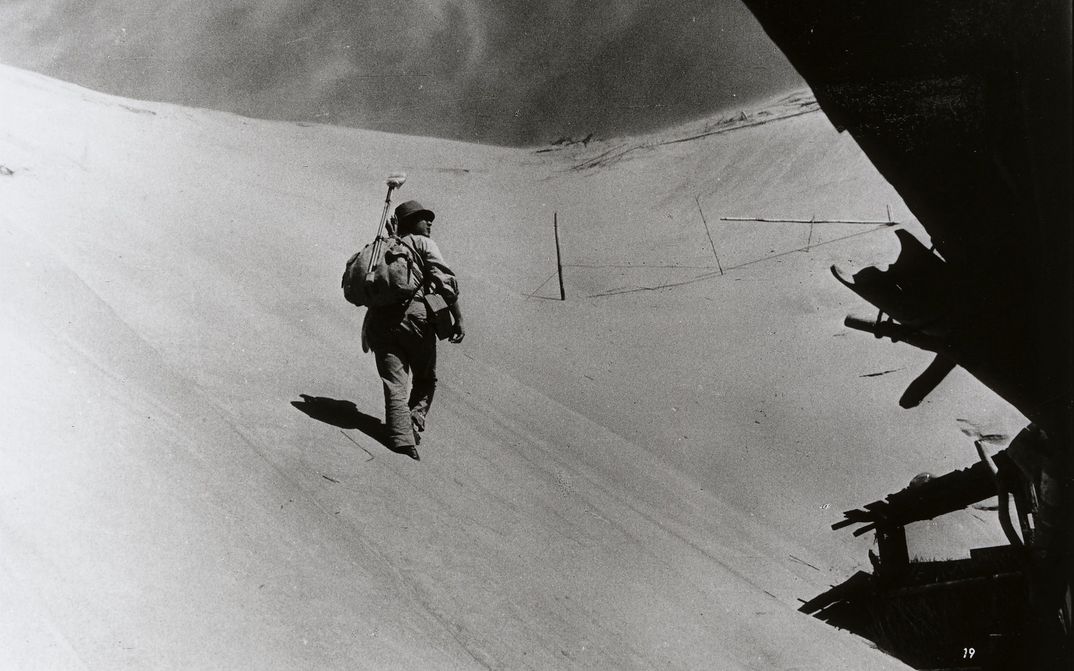 A schoolteacher and hobby entomologist from Tokyo travels to an area of sand dunes to collect insects. After he misses the last bus, the villagers lead him to a hut at the foot of the dunes where he can spend the night with a local widow. The next morning he realizes he is trapped in the hut with the woman, surrounded by steep slopes of sand that must be continually shoveled away if they are to avoid being buried. The struggle to keep digging is now a fight for his life. Although he initially resists and seeks to escape, he eventually accepts his fate and abandons his former identity. Sand is ever flowing and perpetually in flux in this parable of human existence, which also brought Teshigahara fame in the West.