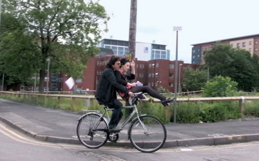 Filmed on one of the most miserable sites of the industrial revolution in Manchester, referred to as Little Ireland. Today, we see a parking lot, an old factory of the times and new complexes of luxurious living still in development since the recent economic crisis slowed down gentrification. The film takes as its starting point Friedrich Engel’s biography, namely his relationship with Mary Burns, an illiterate and fierce Irish worker with radical opinions who showed him the darker parts of the city on which his influential book "The Condition of the Working Class in England" is based. For this video, I am riding in circles on a bike in exactly the spot where Little Ireland once was. While doing so another young woman is reading exactly the parts from Engels’s book that address Little Ireland.