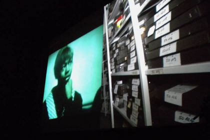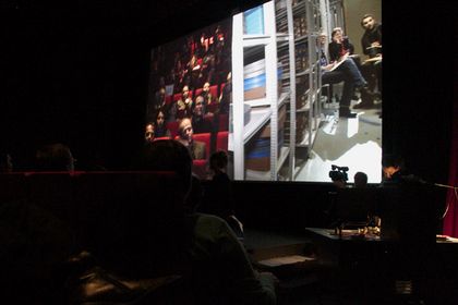 Film did not only emerge from theater and it also serves other dramas than those of the theater. When Arsenal was designed, a cinema stage with entrances and exits, a screen and a stage were also allowed for next to the archive. The building's screening room, the goods elevator behind the projection room, the recording studio behind the screen in Cinema 1, etc, are all being examined for possible associations in the cinema (e.g. windows of light and loud doors, electronic access to sound and image in the cinema, cables, microphones etc.). The work on the editing table will also deal with the opening and closing scenes of the film, searching through a film during playback and this will be documented on video and can then be integrated into the performance: A live making-of a searching-for.