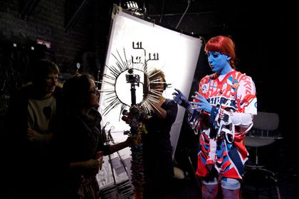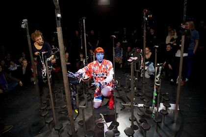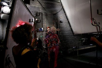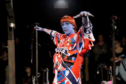 The stage is used by the witch Protektorama as a kind of mobile-phone-TV studio to produce a video of her world healing ritual. Karl Marx, Riki Kalbe, Maya Deren, the Devine Horsemen of Voodoo and Kinder Surprise Eggs prove our obsession with the abstract principles of capitalism. (program text)