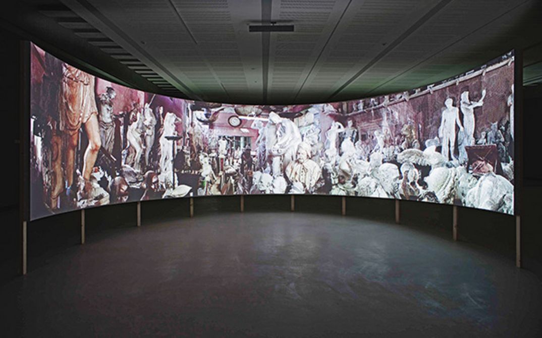 Semicircular video installation, colour, sound, 6 minutes; sculptures: Cinears, Rome; digital 3D scan: Trigonart, Berlin; digital transfer: Thomas Bauer; 3D animation and rendering: Celluloid Visual Effects, Berlin; VFX supervisor: Holger Hummel; CG artist: Dennis Mielke; sound design: Neuton BLN, Thomas Wallmann; Foley artist: Peter Roigk; installation development: Eidotech, Berlin; commissioned and produced by MAXXI, Museo nazionale delle arti del XXI secolo, 2013; courtesy Galerie Jocelyn Wolff, Paris/KOW Berlin.