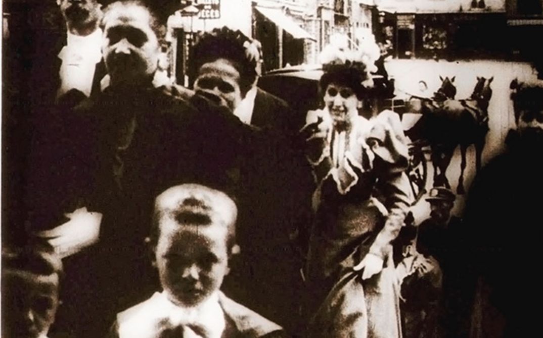 The sister of one of the Lumière brothers’ technicians is getting married. The festively dressed guests walk up a flight of broad steps to enter the building. The camera is located inside, facing outward. The guests are coming from the church square, still visible in the background. The monochrome colouring, the clothing, the look of the street: it’s a photograph from the 19th century. As the group begins to move, it’s as if they are walking past the wedding and into our present.