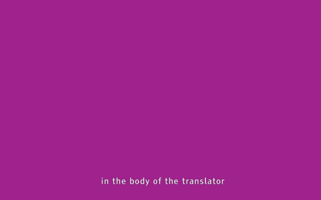 The installation is based on two texts that discuss the act of translating war and resilience. It is designed as an immersive experience, to create a reflective space for the audience to think through the intricacies of the wars in Syria and Iraq, mediated through testimony. The video merely shows a color: purple, projected on a mirrored screen that allows the viewers to see their own reflection, to see themselves within the subtitled text. Lina Mounzer’s essay ‘War in Translation: Giving Voice to the Women of Syria’ weaves the testimonies she is translating with her own personal experience of living through the civil war in Lebanon, and how her own experience shapes how she processes and internalizes the testimonies in order to distill the essence of the words. Stefan Tarnowski’s essay ‘Subtitling a Film’ describes the intricacies of translating subtitles for the anonymous film collective Abounaddara and the special collaborative process of working for someone he has never met. Tarnowski uses this experience to reflect on the role of the subtitle, the details lost in translation, and what additional elements and contradictions are created by the differences between subtitles and image.