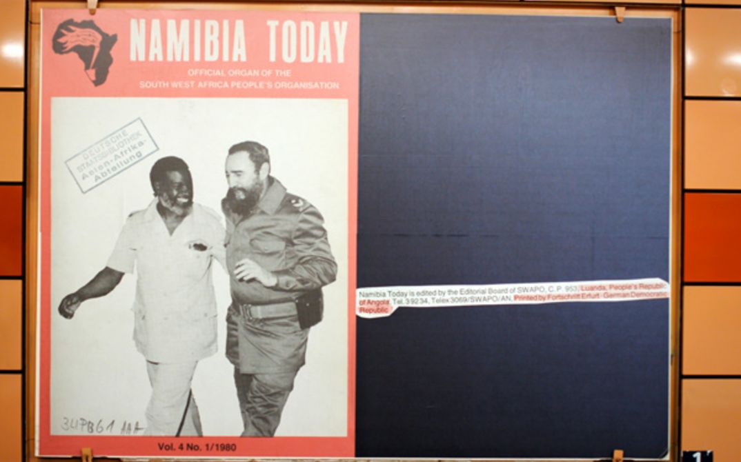 A sequence of billboards lining the walls of the Schillingstraße subway station features covers spanning the periodical’s production in the GDR from 1980 to 1985 alongside related collaged text and images. One shows SWAPO leader and future Namibian president Sam Nujoma with Fidel Castro at the Sixth Summit of the Non-Aligned Movement in Havana, which is juxtaposed with a clipping of the printing credit of Druckerei Fortschritt in the East German town of Erfurt. Another, depicting swapo trainee soldiers perched on a downed South African military helicopter, is coupled with a photograph of printing-house representatives reviewing proofs.