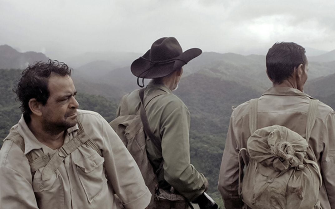Three men in uniform, somewhere in the Cuban jungle, are simulating a mission in Angola. From the mid-1970s to the late 1980s, Cuban troops supported the MPLA, the People’s Movement for the Liberation of Angola. The three veterans practice battle manoeuvres with the machete, or smear themselves with mud as camouflage, and then head deeper and deeper into the dense fauna – with the viewer never knowing exactly where they are headed or why. They have orders, we hear, they have to continue the struggle, to be revolutionaries forever, we hear many times. One of the men begins to doubt the sense of the whole thing, another’s leg slowly rots away, traumatic memories are shared. Entre perro y lobo tells the story of a prolonged revolutionary struggle that isn’t one, of men who just keep on going and only very gradually reach a point where they start asking questions. The rain, fog and dew, the leaves, grasses and branches surround and engulf the three. All of their revolutionary morale-boosting slogans die away in the indifference of nature, which is uninterested in questions of meaning. (ab)