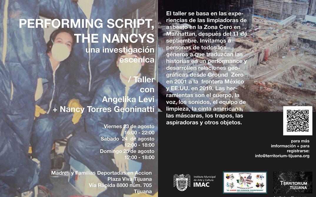 Performing Script (1) took place as part of the exhibition Territorium Tijuana (2) in August 2019 in Tijuana, Mexico. We received support from the organizations Madres y Familias Deportadas en Acción and the Border Line Crisis Help Center (3),in whose spaces the interior shots were also filmed. The three-day workshop was based on texts taken from audio recordings made in 2001 by Nan Torres Geoninatti and Nancy Jancovich, two Argentine asbestos workers in New York.
