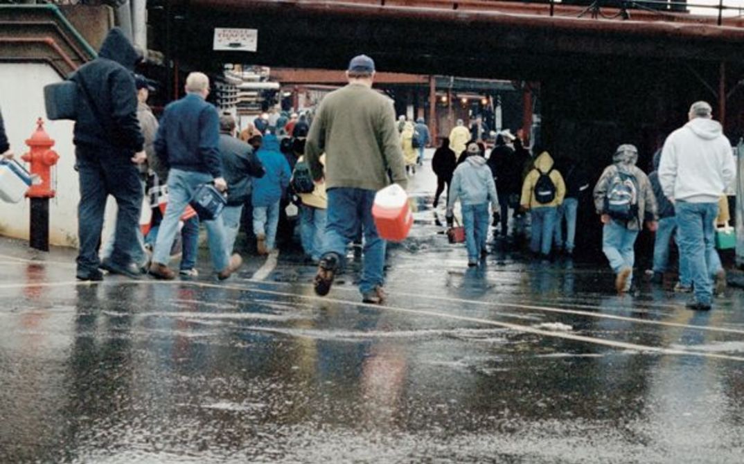 EXIT is filmed over a five-day workweek. Each of the five takes that comprise EXIT shows the long progression of workers leaving the Bath Iron Works at the end of their shift. Each take starts with a title card stating the day of the week, and then begins a daily routine that varies greatly from day to day. Reminiscent of Louis Lumiere's film, Leaving the Lumiere Factory, EXIT emphasizes the flow of time and the nuances of daily experience. (14.11.)