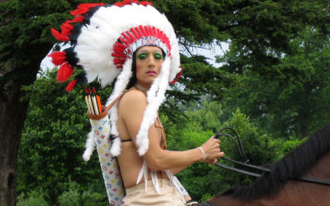 The trilogy features the adventures and histories of Miss Chief Eagle Testickle, the outrageous alter ego of Cree artist Kent Monkman. Turning dismissive writings on the "romantic savage" upside down, she seduces innocent white men with whiskey and dresses them up as more "authentic" examples of the "European male" (GROUP OF SEVEN INCHES), then intercedes into a filmshoot by famed romantic filmmaker Frederick Curtis who plays out on the jealousy between his young sexy Cree actors, whereby teasing the action into a tragic twist (SHOOTING GERONIMO). Finally, Miss Chief Eagle Testickle journeys far across the seas to study the unspoiled European Male in his native habitat (ROBIN'S HOOD). The trilogy, which will be presented looped in an installation, challenges representations of "Indians" in the dominant cultural imaginary and its colonial legacies. Monkman and Gordon create narratives with which they dismantle commonly held assumptions regarding history, Native peoples, and their sexualities.