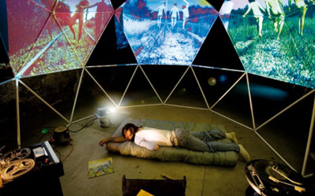 Wildflowers of Manitoba is a performative installation of four short films and sound presented in a furnished geodesic dome. The films feature four young men living off the grid in an idealistic survivalist camp on the shores of lake Winnipeg during the summer of 2006. The loosely scripted scenes establish a naturalist idyll seemingly removed form modernity. Like wildflowers, the male subjects are intimately tied to a seductive meadow that is bordered by abandoned railway tracks and virgin beaches. Staged for the camera, the set and subjects evoke a distant, more innocent era where alternative, collective lifestyles flourished. The music by visionary seventies Québécois rock band Harmonium suggest the potential for sexual and political freedom. Noam Gonick and Luis Jacob's young male subjects perform homosocial activity to achieve spiritual transcendence. While an intense presence is projected by each body on screen, the subjects lose their theatrical pretense when dwarfed against the Canadian landscape of water, sky, rocks and bush. The effect is an unpretentious filmic experience that urges you to fantasize a sequel.