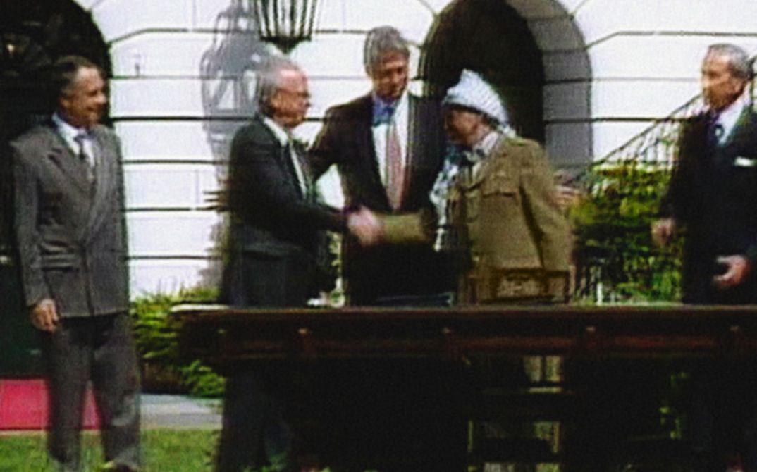 September 13, 1993: Two national leaders reach out and shake hands, while a third one watches. Yasser Arafat, Yitzhak Rabin, and Bill Clinton in the garden of the White House. A historic moment, repeated 20 times, tainted by countless shattered hopes. On the soundtrack Edward Said expresses his outrage at the Oslo Peace Accord which was settled by this handshake.