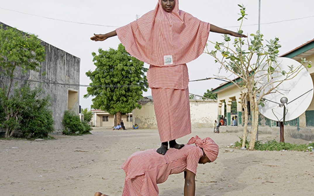 We see the students moving from the classroom to dense green forest in dream-like scenes, expanding on the social surrealist language Rahima Gambo developed in 2017. These spaces act as a backdrop to the choreographed moving sequences the students helped created in the Tatsuniya Workshop, a storytelling workshop the artist holds with the students to develop the narratives we see in the film. “Tatsuniya” means a fable, short story, or riddle in the Hausa language.
