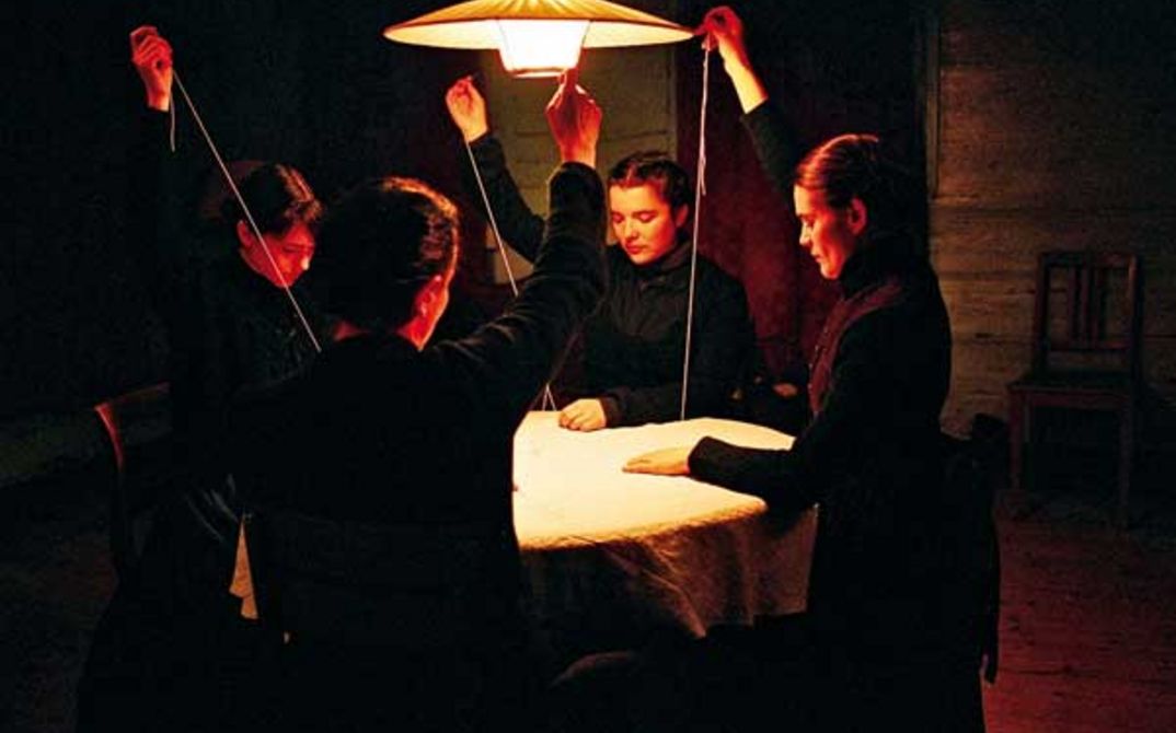Dieser Film scheint aus der Zeit gefallen. Durch einen streng ritualisierten Tagesablauf erschaffen sich die Mutter und ihre fast erwachsenen Töchter jedoch ihre ureigene Gegenwärtigkeit. Die Kamera fängt sie mit stilisierten Tableaus ein, choreografiert einen Gleichklang der Gesten und Handgriffe. Das gemeinsame Beten des Rosenkranzes, das gegenseitige Bürsten der langen Haare, das Hochstecken zu strengen Frisuren, das rhythmische Sticken am wärmenden Kaminfeuer. Winterstilte ist auch ein Spiel mit Symbolen und Zeichen, die auf die Endlichkeit dieser Frauengemeinschaft verweisen. Eine wissende Eule erscheint am Schlafzimmerfenster, in der Nacht suchen maskierte Männer mit Hirschgeweihen die Berghütte auf und eine buntgekleidete Gestalt wandert durch den Schnee. Man spürt, dass die jungen Frauen den Hof bald verlassen werden, um den Rhythmus eines eigenen Lebens zu finden.
