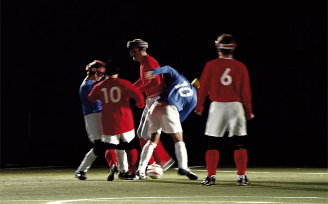 BLIND beobachtet eine Gruppe blinder FußballspielerInnen bei einem Spiel. Bei Nacht gefilmt, zeigt die Auseinandersetzung mit den Themen Sehen und Blindheit die Spieler auf einem Feld, in Nahaufnahme und im Detail.