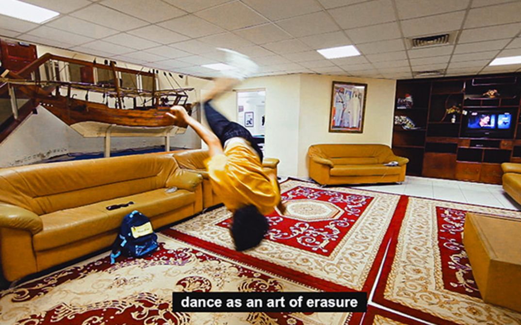 Eine einzelne Einstellung dokumentiert eine improvisierte Tanzprobe: ein Breakdancer versucht, zu traditioneller emiratischer Musik zu tanzen. Die Aufzeichnung der Performance dekonstruiert ritualisierte Ton und Schrittfolgen und betont damit die Fluidität der Bedeutung von Bewegung, die in Traditionen eingeschrieben sind. In diesem Prozess erscheint Tanz als Kunst des Auslöschens. Die Bewegungen des Tänzers bekommen neue Bedeutungen und reflektieren, wie die sich ständig verändernde Natur von Choreografie (Bewegung) auch neue Weisen des Zuhörens erschaffen können: Woher kommt Tanz und wohin entwickelt er sich?