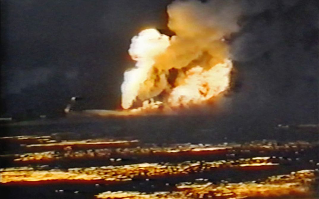 Wie hat sich das Bild, das wir uns von der Apokalypse machen, angesichts der massiven Umbrüche und der Ungewissheiten der heutigen Welt verändert? Ist unsere Vorstellung davon immer noch innerhalb eines romantischen religiösen Rahmens verortet, oder hat sich die Imagination in dunklere, unbekanntere Territorien verschoben? Behind the Sun untersucht das verfallende Porträt vom Ende der Welt mit Hilfe von dokumentarischem Bildmaterial: VHS-Aufnahmen brennender Ölfelder in Kuwait in 1991, die nach dem Zweiten Golfkrieg (dem ersten Irakkrieg) von den auf dem Rückzug befindlichen irakischen Truppen in Brand gesetzt wurden. Die Bilder dieses Infernos werden mit Audiomonologen aus islamischen TV-Programmen kombiniert, wodurch sich Momente des Erhabenen in das Bild der Zerstörung einfügen.