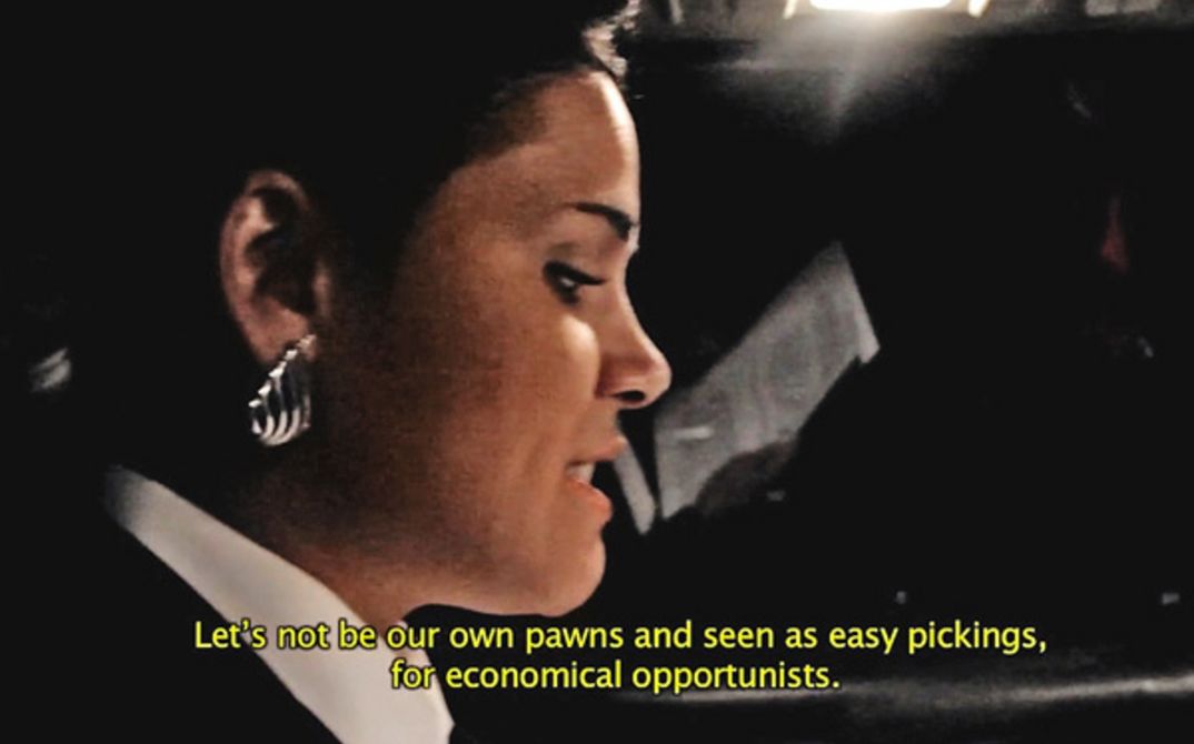 Sind wir immer noch Sklaven? Bin ich ein Sklave? In Black President verkörpert die ‚Weiße Königin‘ – eine von Kudzi erdachte Figur – die Idee eines externalisierten und internalisierten Quasi-Kolonialismus. Zunächst erscheint sie in einer Arbeit Kudzis, dann tritt sie aus dem Rahmen heraus und in die Welt des Films ein. Bald schon macht sie sich selbstständig und verärgert alle um sich herum mit dem Versuch, jede afrikanische Person und jedes afrikanische Objekt, dass ihr ins Auge fällt, zu kaufen. Wie wird das nur enden? Wann werden wir Afrikaner aufhören, uns ins eigene Knie zu schießen, nur um zu beweisen, dass wir mit dem sogenannten westlichen Standard mithalten können? Werden wir Afrikaner uns jemals von dieser Last befreien können? Wann endlich werden wir diese Ideen lynchen (Mpumelelo Mcata)