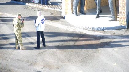 As the buses carrying the workers arrive at the site, they are met by the Russian commanders. Most are wearing military fatigues with no insignia. Among them, there’s one person whose outfit contrasts starkly with the rest of the invaders. In figure 1, he’s to the right: