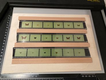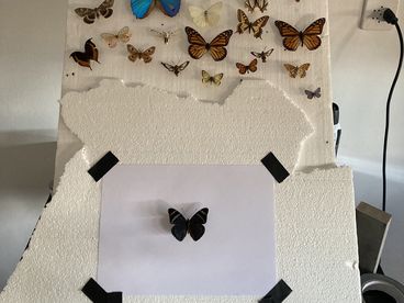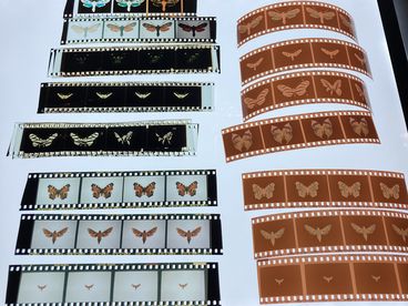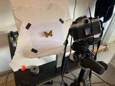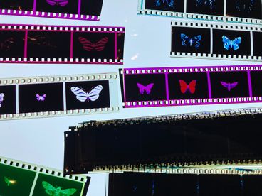 Dokumentationen des Arbeitsprozesses geben Einblicke in die analoge Dia-Projektion und die Inszenierung schwebender Schmetterlinge.