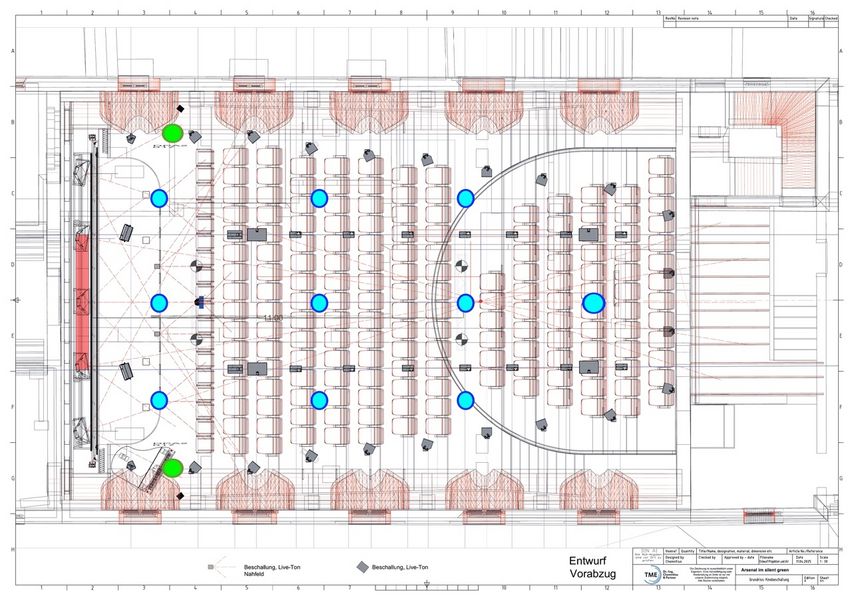 Reihen: 13 Reihen mit fest installierten Plätzen, erste Reihe optional / nach Bedarf bestuhlbar