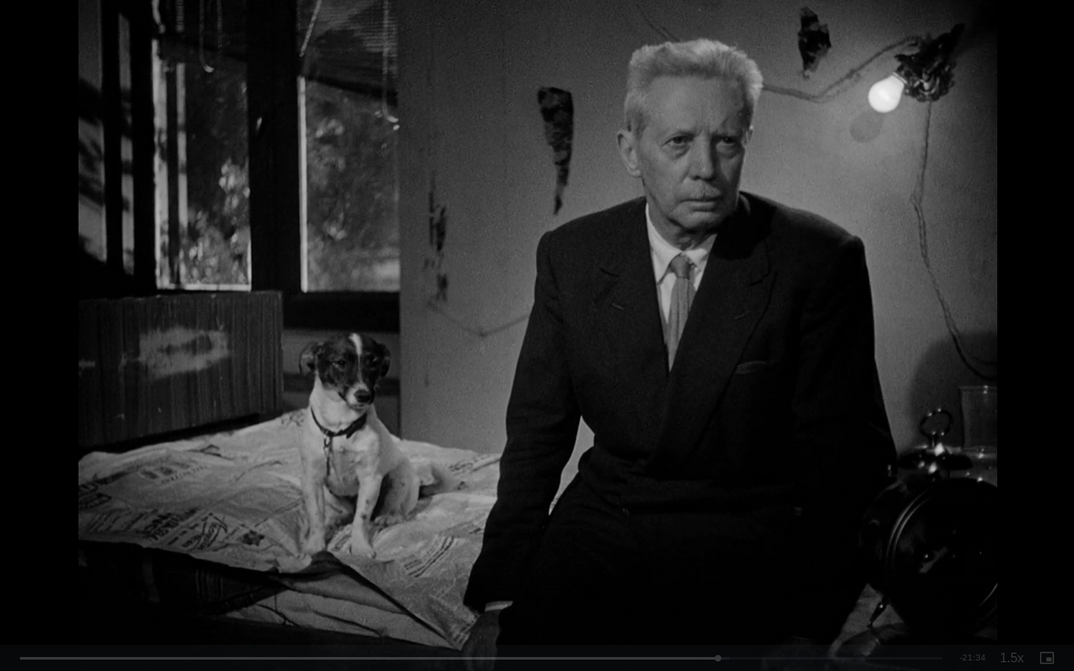 Die Beamtenpension von Umberto D. ist so gering, dass sie ihm nicht einmal das Existenzminimum sichert. Wegen Mietschulden droht die Wirtin seines ärmlichen Zimmers, ihn auf die Straße zu setzen. Der einzige Mensch, dem er sich anvertrauen kann, ist seine schwangere Nachbarin, sein einziger Freund ist sein Hund. Vittorio De Sica widmete den aus der Perspektive eines einsamen alten Mannes erzählten Film seinem Vater. Bei seiner Erstveröffentlichung war er ein kommerzieller Misserfolg, heute gilt er als einer der bedeutendsten Filme De Sicas. „UMBERTO D. scheint mir auch heute noch so lebendig, so wahr, so tief, dass ich ihn unter allen meinen Filmen am meisten schätze.“ (hjf)