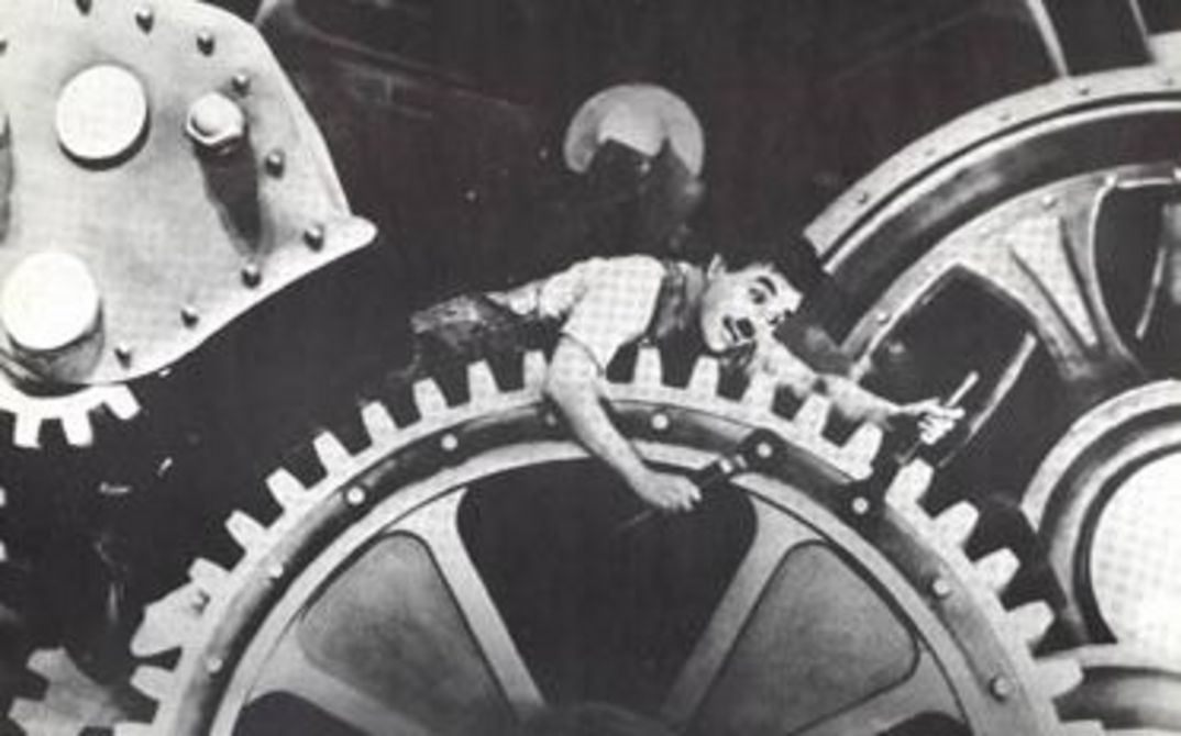 MODERN TIMES (Charles Chaplin, USA 1936, 8. & 15.11.) Der anarchische Tramp im Kampf mit gigantischen, ihn zwischenzeitlich verschlingenden Maschinen. In seinem fröhlichen Überlebenskampf verkörpert er die völlige Freiheit von Zwang und Ordnung.