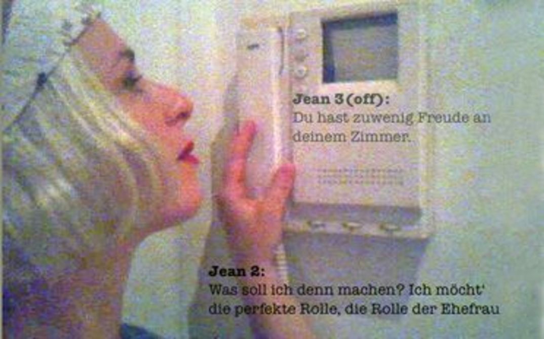 "Das Idealbild der weißen Frau – verführerisch, aber nicht nuttig, gut verheiratet, aber nicht an die Wand gedrängt, berufstätig, aber nicht übertrieben erfolgreich, um bloß nicht ihren Kerl plattzumachen, schlank, aber nicht panisch in Sachen Ernährung, […] in ihrer Mutterrolle aufgehend, aber nicht nur noch an Babywindeln […] denkend, […] durchaus kultiviert, aber ja keine ernsthafte Konkurrenz für ihren Mann, diese glückliche weiße Frau, die man uns ständig unter die Nase hält, der wir nach Leibeskräften nacheifern sollten, auch wenn sie sich ohne besonderen Grund zu Tode langweilt, die ist mir sowieso noch nie und nirgends begegnet. Ich glaube fast, die gibt es überhaupt nicht." Virginie Despentes (Videoinstallation, KW)